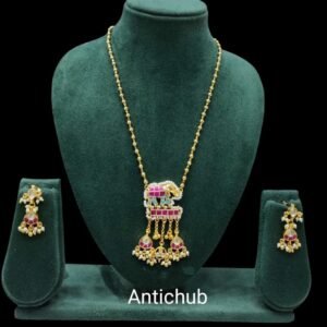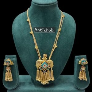 This is a beautiful high-gold long necklace set with a Chandan Patti design, featuring intricate heritage craftsmanship. The elegant pendant showcases a combination of detailed filigree work and embedded stones, making it a timeless piece. The earrings complement the necklace perfectly with their jhumka-style embellishments.