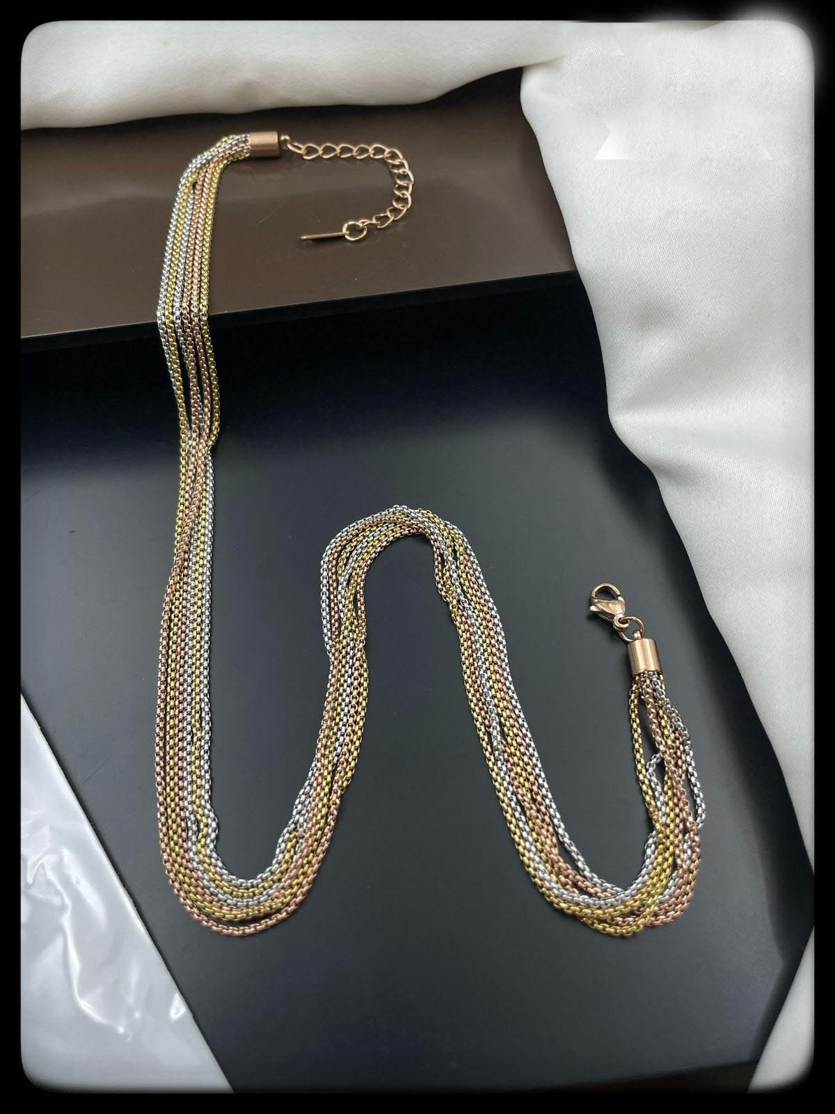 The Elegant Multicolor Stainless Steel Rope Chain Necklace is a stunning blend of sophistication and versatility. Designed with three-tone plating—gold, silver, and rose gold—this necklace adds depth and elegance to any outfit. The twisted rope chain style creates a textured and eye-catching appeal, making it perfect for both formal occasions and everyday wear. Crafted from premium stainless steel, it is tarnish-resistant, durable, and skin-friendly.