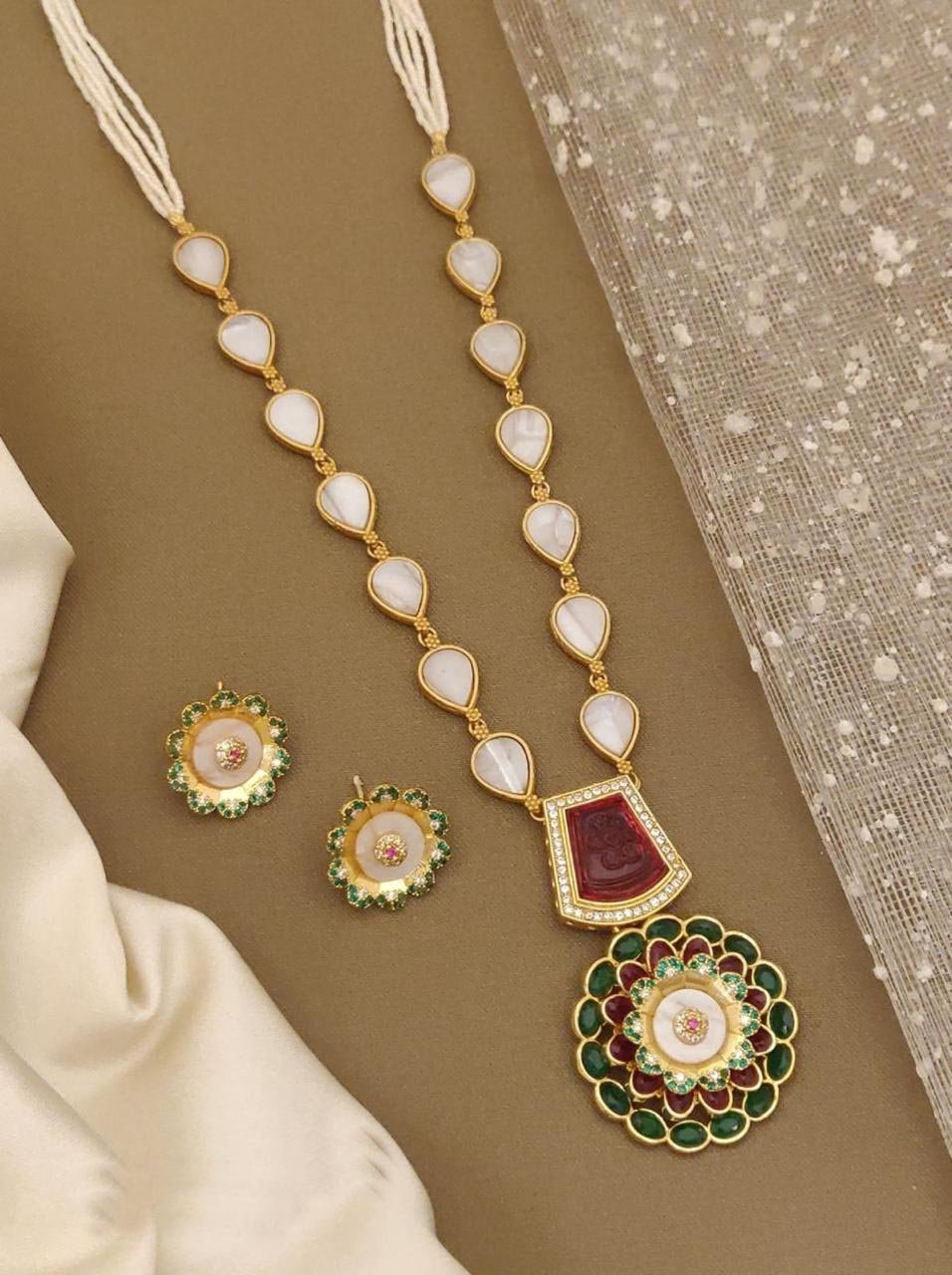Necklace: The long necklace consists of multiple strands of tiny white seed beads, giving it an elegant and delicate look. The upper portion of the necklace includes pastel blue and pink faceted beads, separated by gold-toned accents and turquoise stones. The pendant is a circular piece made of mother-of-pearl with an intricate floral Kundan work in gold, red, and blue enamel. Small blue bead danglers add a touch of grace to the design.