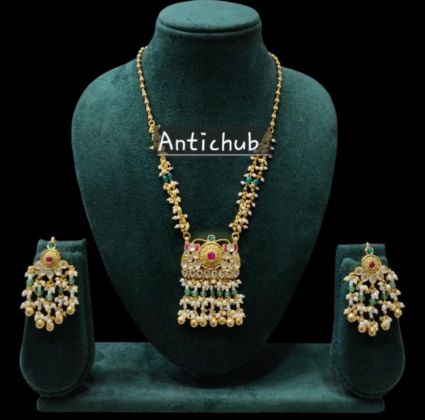 Stones: Kundan, ruby-colored gemstones, and emerald beads